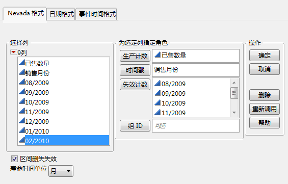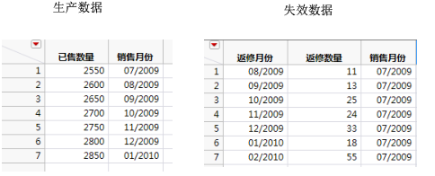 事件时间格式显示生产数据和失效数据。与 Nevada 格式和日期格式不同,“事件时间”数据不包括日期时间信息,如生产日期或失效日期。这种格式还支持在数据中包含任意删失模式。请参见使用事件时间数据定义风险集合。