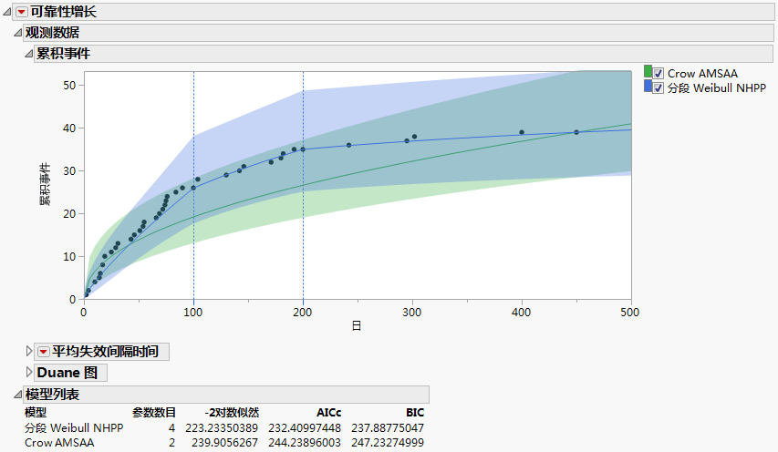 运行报表时,“累积事件”图会更新以显示分段模型。蓝色垂直虚线显示每个阶段的转换时间。“模型列表”随之更新。请参见图 10.17,其中已对 TurbineEngineDesign1.jmp 中的数据进行了 Crow-AMSAA 模型和分段 Weibull NHPP 模型拟合。请注意,在“模型列表”报表中会比较这两个模型。