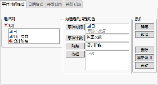 其他三种数据格式假定将时间记录为时间单位数,例如自系统最初启动以来的天数或小时数。检验开始时间假定为时间 0。在“事件时间格式”选项卡上,为一个或多个时间列分配“事件时间”角色。