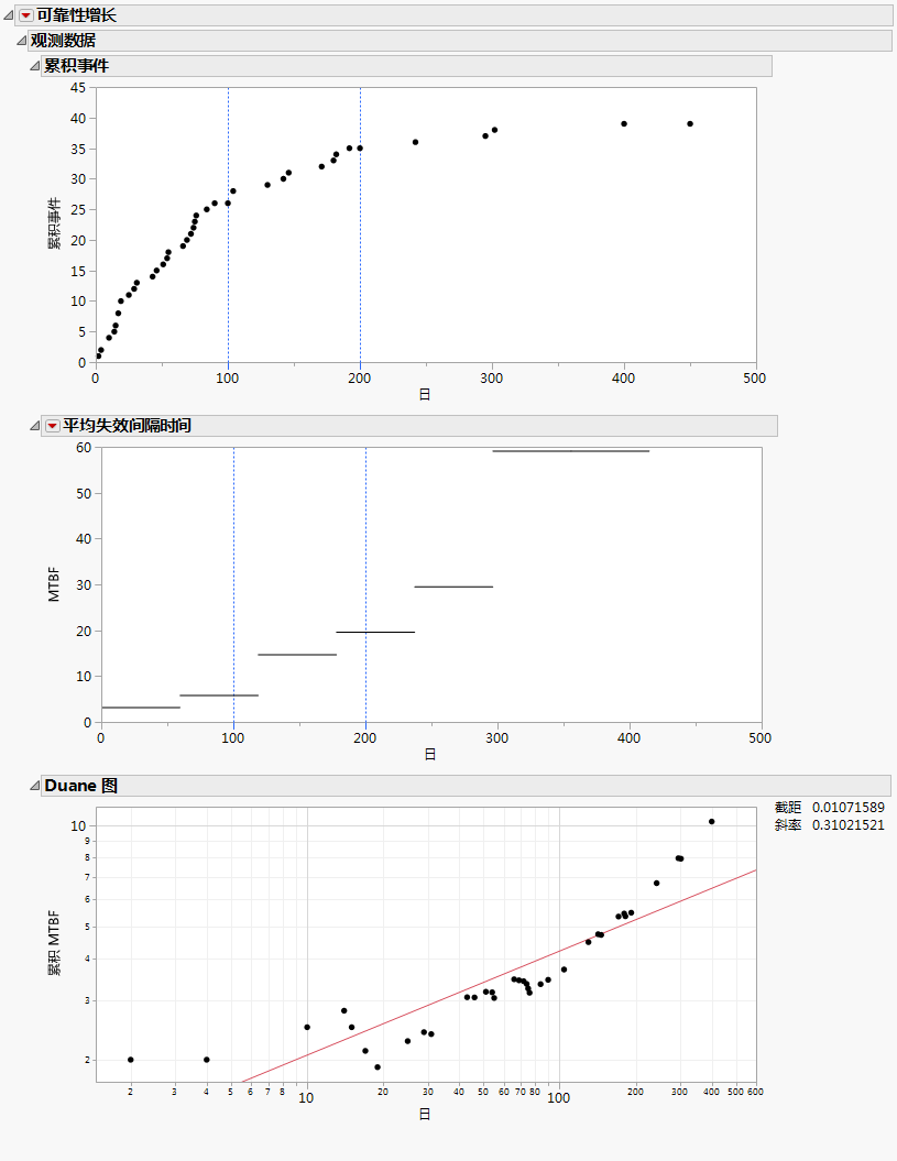 “观测数据”报表包含累积事件图、平均失效间隔时间图和 Duane 图。这些图如图 10.7所示,在该图中打开了“平均失效间隔时间”报表和“Duane 图”报表。要生成该报表,请按使用“可靠性增长”平台的示例中的说明操作。