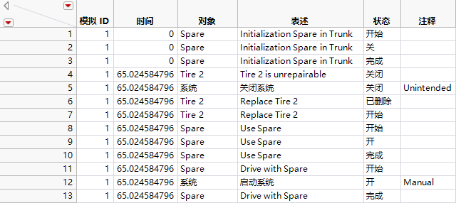 下一事件是在第一次模拟迭代经过大约 65 天后发生的 Tire 2 is Unrepairable。在第五行中,系统意外设置为“关闭”状态,因为只有三个轮胎能正常使用。Need 4 Tires to Drive 结点要求至少有四个轮胎(包括备胎)才能正常使用。Tire 2 is Unrepairable 事件同时触发了 Replace Tire 2 操作和 Use Spare 操作。第 11 行中触发了 Drive with Spare 操作,系统被设置为“开”状态。