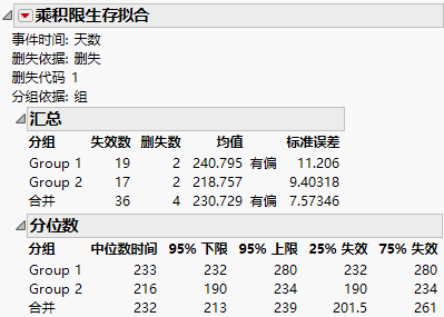 “分位数”数据显示单个组和合并组的失效时间统计量,其中包括中位数生存时间(带 95% 置信上限和置信下限)。中位数生存时间是一半对象失效时的时间(天数)。还包括四分位数生存时间(25% 和 75%)。