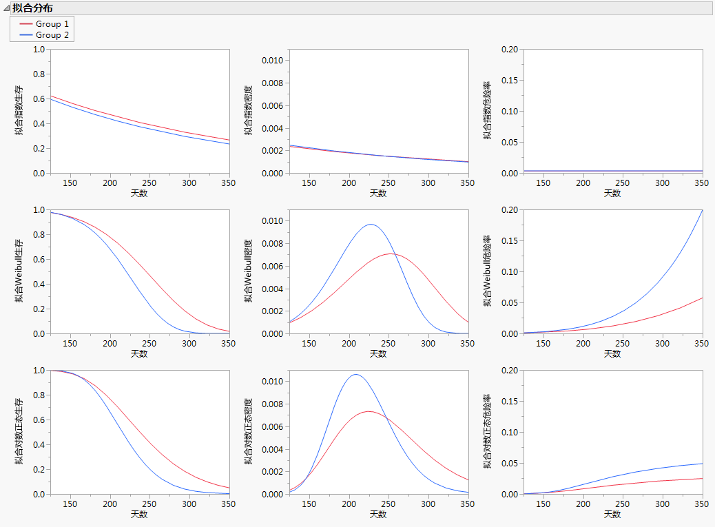 使用“拟合分布图”选项可以查看指数、Weibull 和对数正态分布的生存、密度和危险率图。这些图共享相同的轴尺度以便可以轻松比较各分布。