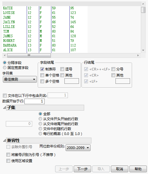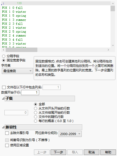JMP 检测文件结构,并显示用于导入文本(具有分隔符或固定宽度字段)的选项。若 JMP 选择了错误的文件结构,点击分隔字段或固定宽度字段单选按钮可导入正确格式的数据。(例如,在文件实际具有分隔符时可能出现固定宽度窗口。)