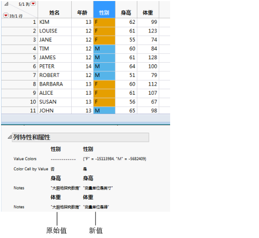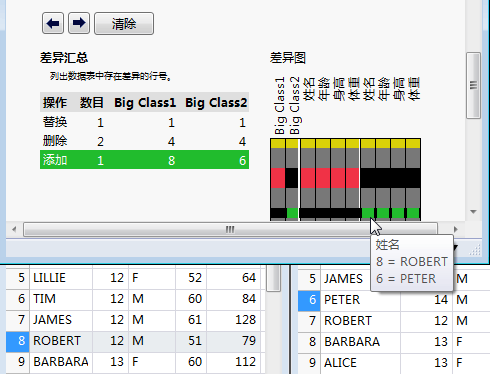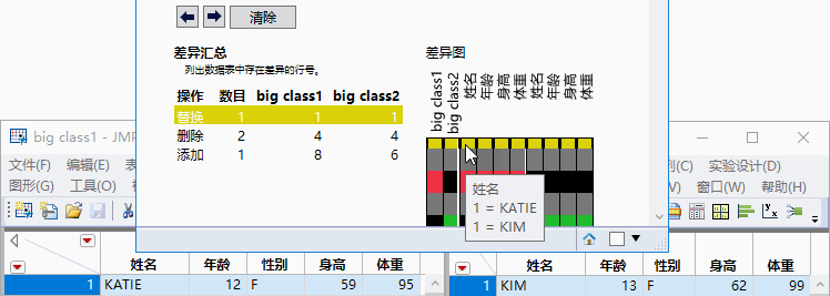 要以图形方式显示比较,请将光标置于“差异图”中的着色单元格之上。图 4.23显示 Big Class1.jmp 中的姓名 KATIE 改为 Big Class2.jmp 中的 KIM。整个第一行在“差异图”中突出显示,指示该行中的所有值都不同。
