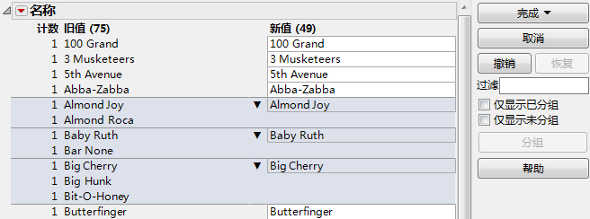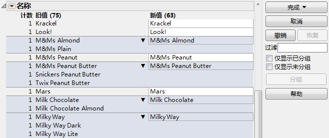 选定多个值时将变为可用。点击分组可使突出显示的值分到同一组中。若您在分组前编辑过值,则编辑过的值会成为“新值”列中的组代表。否则,出现次数最多的值会成为组代表。