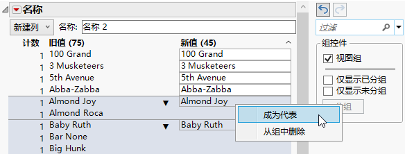 右击选定值可选择不同的分组值或组代表。分组至命令显示数据表中出现次数最多的“旧值”。若新值和旧值不同,还会连同显示其相应的新值。该列表显示前 8 个可能的组代表。
