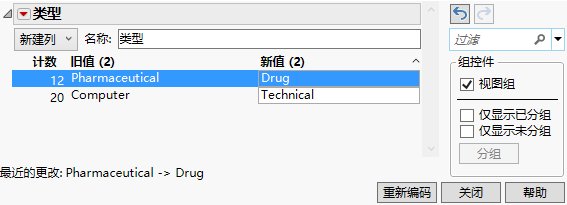 在”重新编码“窗口的新值框中输入所需的值。对于本例,在“Computer”行中输入“Technical”,在“Pharmaceutical”行中输入“Drug”。
