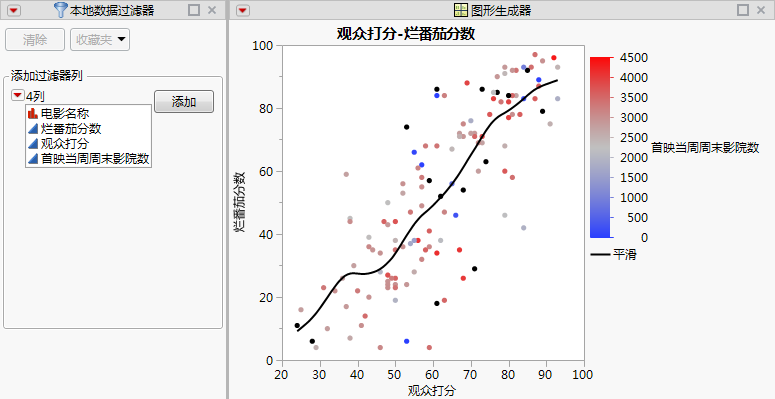 在新数据表中,运行图形生成器: 按首映当周周末影院数划分的观众打分表脚本以创建报表。