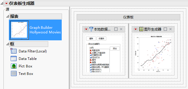 随之查询 Hollywood Movies.jmp 数据表,并且该仪表板打开以显示本地数据过滤器和更新的报表。