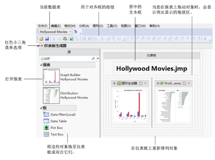 样本数据表生成的。这些报表添加到右窗格中。“Hollywood Movies.jmp”显示在添加到仪表板中的文本内,该文本框使用工具栏按钮居中显示。