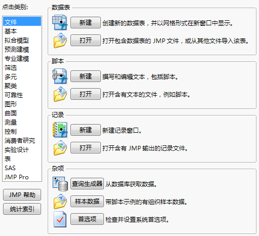 图 2.18显示 Windows 中的“JMP 起始页”窗口。Macintosh 中的“JMP 起始页”窗口与此完全相同。