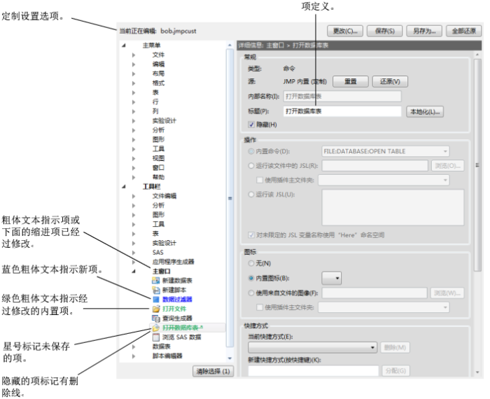 在“菜单编辑器”中对工具栏和菜单进行个性化。修改的项的名称经过格式设置,可指示创建、修改或隐藏了哪些项以及哪些项未保存,如