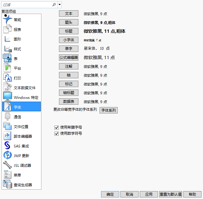 “字体”首选项用于定制报表、数据表和脚本的外观,包括字体、文本大小和字体样式。