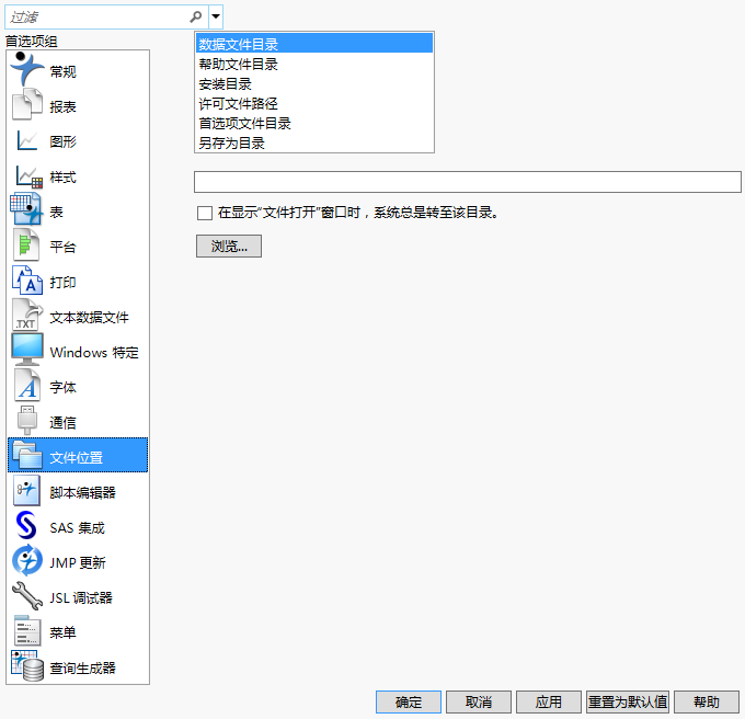 (仅限 Windows)“文件位置”首选项设置 JMP 系统文件的默认位置。通常文件会放在 JMP 安装它们的位置,您不必进行任何更改。但是,若要将文件(如帮助文件)移到别的位置,应在此处更新位置。