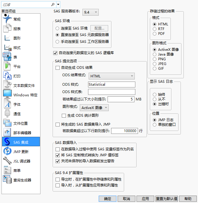 选择 SAS 服务器的默认版本。也可以在“服务器连接”窗口中更改该信息。(请参见“导入数据”一章中第 74 页的“连接至 SAS 元数据服务器”。)连接到 Windows 上的本地 SAS 时,该选项不适用。