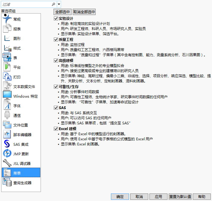 “菜单”首选项基于您使用 JMP 的方式显示和隐藏菜单。这使您浏览更少的菜单项并简化 JMP 界面。例如,若您从不设计实验,可以取消选择