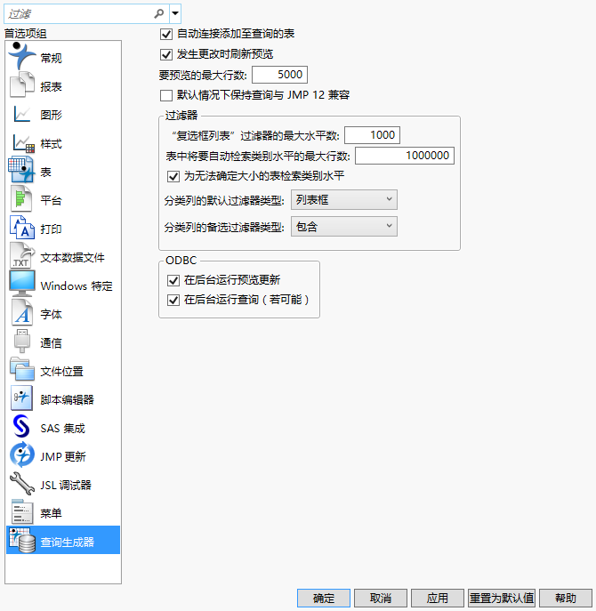 保持查询与 JMP 12 兼容。在 JMP 13 或更高版本中打开标记为 JMP 12 兼容的查询时,无论该首选项如何设置都会隐藏引起兼容性问题的功能。