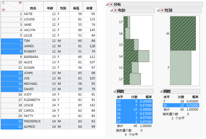图 9.9 包含男性的行在数据表和直方图中突出显示