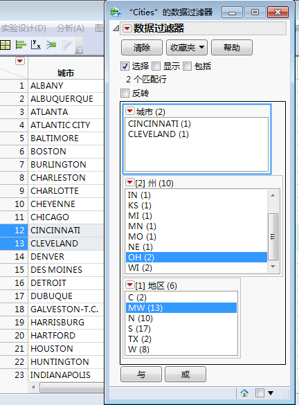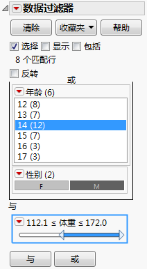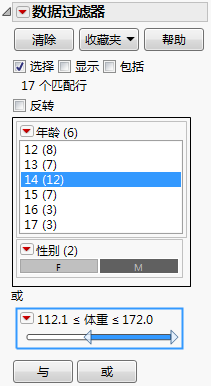 若您在“数据过滤器”中选择了多个名义型或有序型列,则该选项将在进行新的选择之前清除所有其他选择。以 Big Class.jmp 为例,假定您的数据过滤器中有性别(名义型)和年龄(有序型)这两列。若为性别选定了男性 (M),然后点击某个年龄组,比如 12 岁年龄组,您之前做出的男性选择将自动清除。这意味着选择 12 岁并不以选择男性为前提条件。反之,若禁用“自动清除”,您则可以同时选择男性和 12 岁。默认启用“自动清除”。