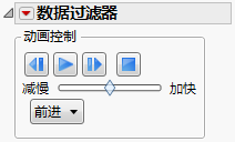 要使用动画功能,请从“数据过滤器”旁边的红色小三角菜单中选择动画,然后选择要动画播放的变量。变量四周突出显示的框指示已选定该变量进行动画播放。