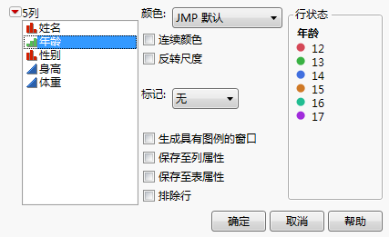 在某些图中,您可以通过添加行图例基于点的值更改标记的形状或颜色。之所以称为行图例,是因为 JMP 会使用行颜色或行标记设置自动插入图例。以这种方式指定标记或颜色时,将为图形中的所有点指定特征,无论您选定了哪些点。所有以前的标记和颜色设置都将被覆盖。