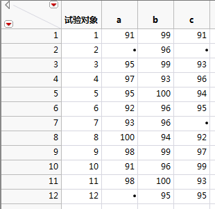 请注意试验对象变量包含不等组。多数试验对象都接受了全部三种药物,但试验对象 2 只接受了一种药物,试验对象 7 和 12 只接受了两种药物。在这种情况下,为确保正确的测量值与正确的试验对象关联,请将试验对象指定为分组变量。