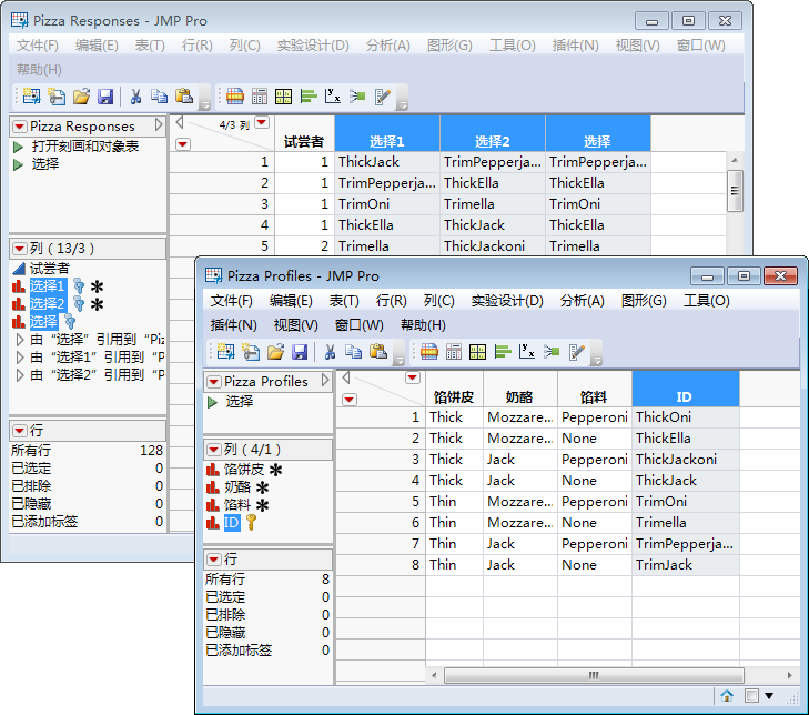 图 6.36显示虚拟连接的数据表的一个示例。Pizza Profiles.jmp 是被引用的数据表,因为 ID 列包含一个“链接 ID”列属性。该 ID 列包含对应于引用数据表 Pizza Responses.jmp 中数据的唯一值。