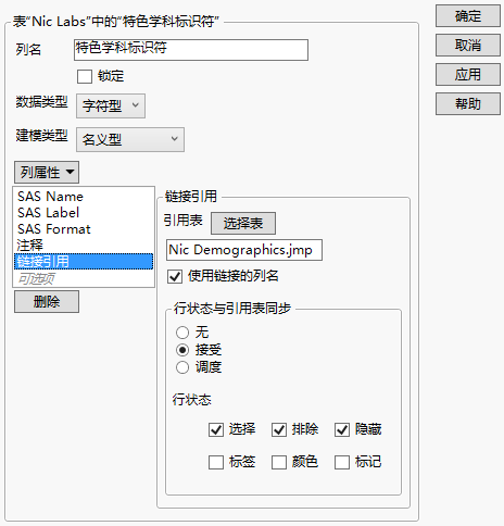 请注意,选择了“接受”。这意味着当引用的数据表 (Nic Demographics.jmp) 中的行包含某个行状态时,该行状态自动显示在当前数据表中。