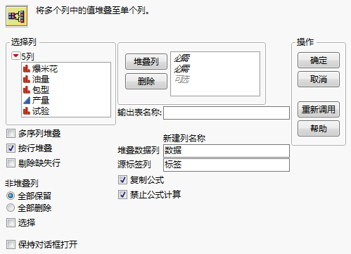 从新表中剔除缺失数据。若同时选中了按行堆叠,则只会剔除所有数据都缺失的行。