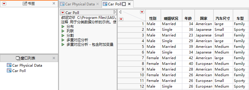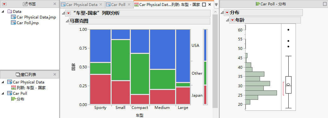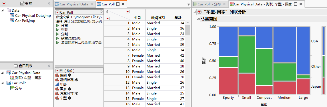 在 Car Physical Data.jmp 中,运行列联脚本。
