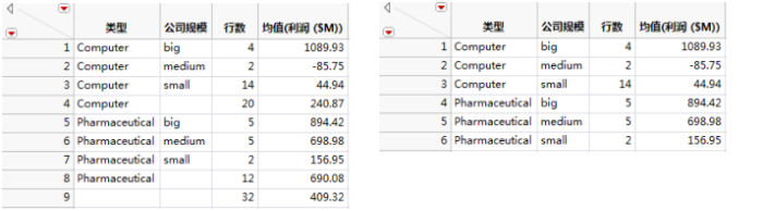 要向输出列添加分组变量的边缘统计量,请点击包含边缘统计量旁边的框。除了为每个分组变量添加边缘统计量,JMP 还会在表末尾添加汇总第一个分组变量各水平的行。