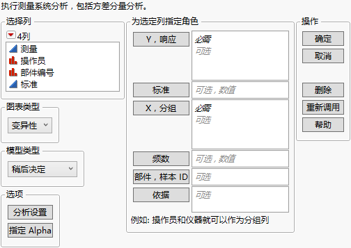 在变异性量具分析(对于连续响应)和计数量具分析(对于分类响应,通常为“通过”或“失败”)之间作出选择。