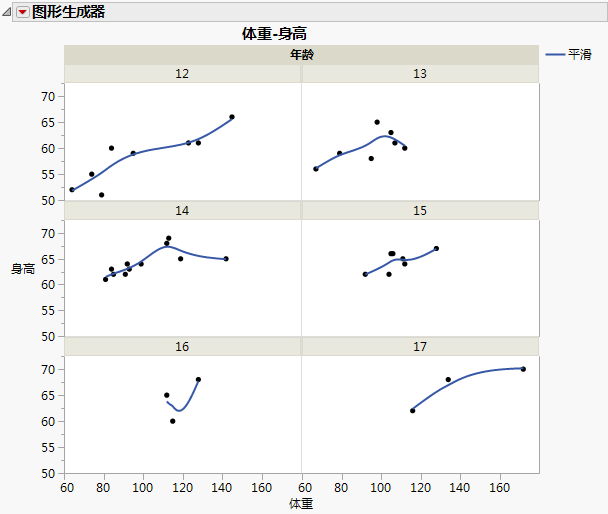 随即显示Big Class.jmp 的“图形生成器”窗口 中的图。每个年龄值的身高和体重之间的关系都使用颜色显示在一个图形中。