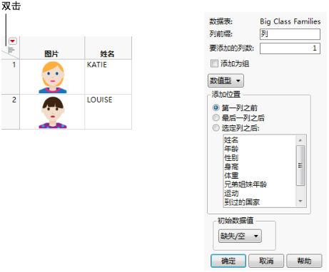 • 双击数据表最后一列右侧的空白区域可添加一列。有关在添加列后更改特性的详细信息,请参见关于“列信息”窗口。