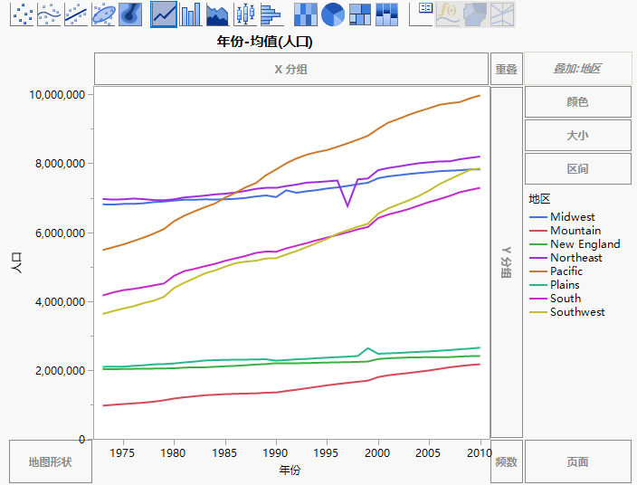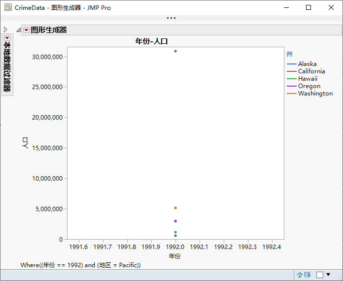 该图显示了不同年份受不同犯罪率影响的每个美国地区的人口均值。在悬停标签图中,您希望看到一个更加细化的视图,其中显示的是美国各州而不是地区的影响。