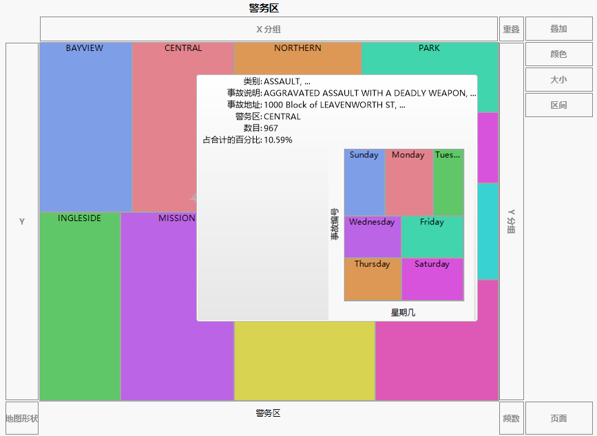 悬停标签图显示了每个警务区各周中星期几所发生的事件数。而在本例中,您想要按类别查看每个警务区发生的事件数。