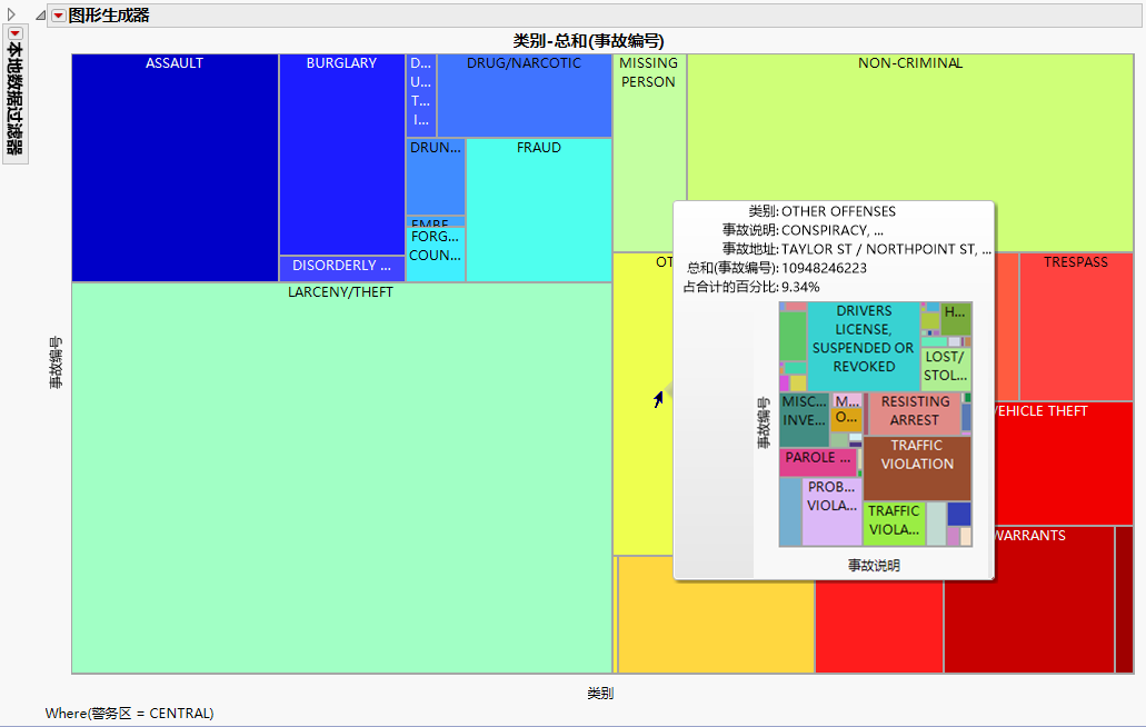 悬停标签图显示了按类别划分的每个警务区发生的事件数。