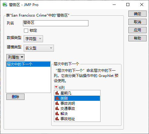 1. 在 San Francisco Crime.jmp 数据表中,右击警务区列标题并选择列属性 > 层次中的下一个。