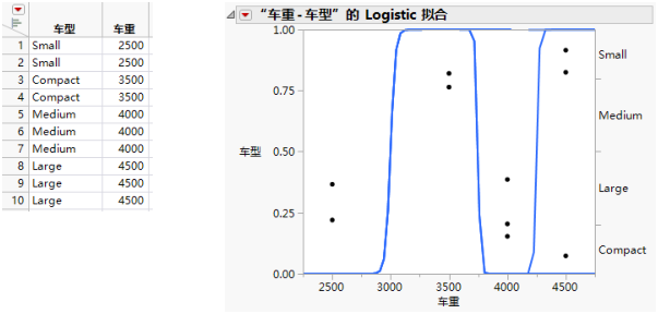 该示例使用 Car Physical Data.jmp 样本数据表来显示 Logistic 图的更多示例。假定您要使用 116 辆汽车的车重来预测汽车尺寸(车型)。汽车尺寸可以为以下值之一(按最小到最大的顺序排列):赛车、小型车、紧凑型车、中型车或大型车。