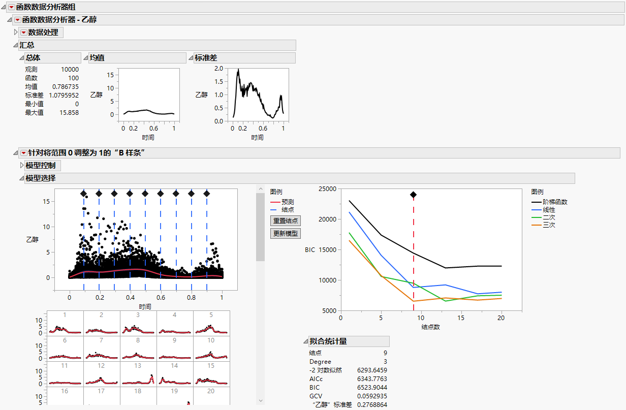 乙醇的“函数数据分析器”报表 和乙醇的“模型汇总”报表 显示一个函数过程变量“乙醇”的模型报表。滚动整个报表以查看每个过程变量的模型拟合情况。接着,在分析中使用“函数汇总”报表中的 FPC。