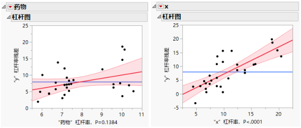 比较药物检验数据的杠杆图 显示每个效应的杠杆图。由于协变量显著,药物的杠杆率值距离其最小二乘均值有些分散。