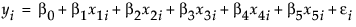 这样指定会将两列(分别为 x4i 和 x5i)添加到线性模型,这允许协变量斜率在药物不同水平下有所不同。通过将药物的指标变量乘以协变量值得到新变量,公式如下:
