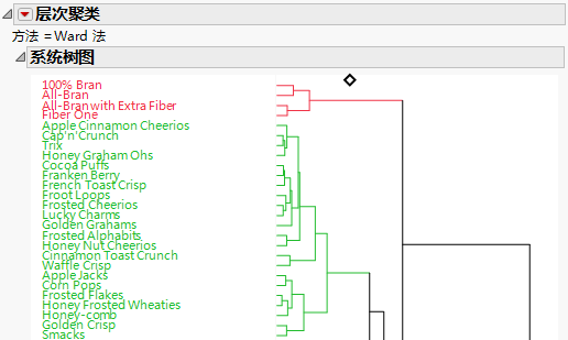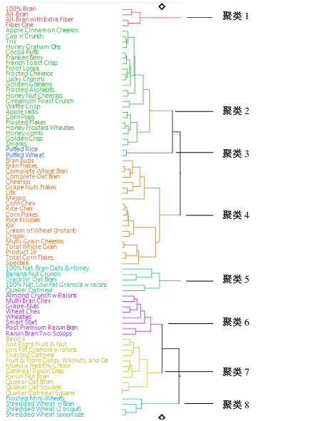 通过查看树状图中的结合点,您会发现每个聚类中哪些谷物早餐最为相似。