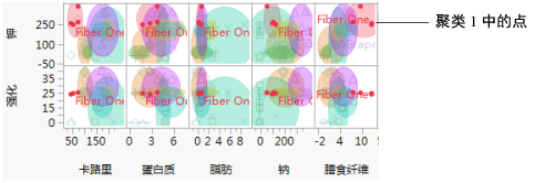 请注意“钾”行中的膳食纤维图。选定的谷物早餐位于图右侧 8 克到 13 克之间。这一位置表明聚类 1 中的谷物早餐的膳食纤维和钾含量都较高。