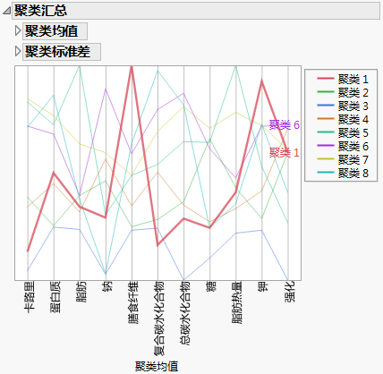 报表底部的聚类汇总图显示各个变量在各个聚类中的均值。例如,相对于其他聚类中的谷物早餐,该聚类中的谷物早餐含有更多的膳食纤维和钾。