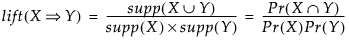 提升度的分子是 X 与 Y 同时出现的交易的比例。分母是 X 与 Y 同时出现的期望概率的估计值(假定它们的出现无关联)。