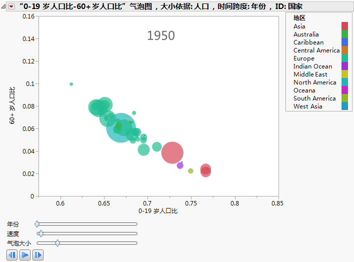 点击播放/暂停按钮播放随年份的推移而变化的气泡图动画。随着时间推进,0-19 岁人口比人口减少,60+ 岁人口比人口增加。