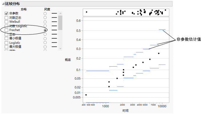 2. 在“比较分布”报表中,选择“尺度”列中的 Fréchet。