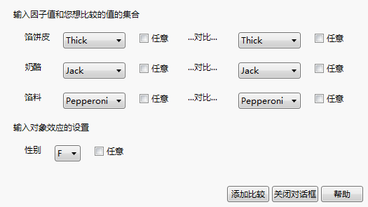 执行两个特定备择选择特征之间的比较。支持您选择要比较的因子和值。您可以比较特定的配置:包括通过选中任意复选框来比较左侧或右侧的所有设置。若有对象效应,您可以选择要比较的对象效应水平。使用“任意”并不会对所有不同特征的组合进行比较,而是所有两两特征的组合进行比较,一次比较一个特征,对于其他因子维持左侧显示的设置。